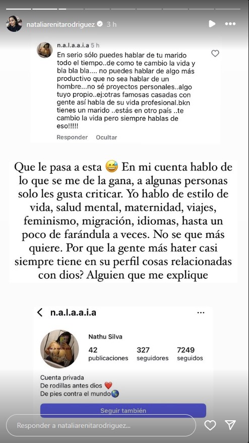 "Qué le pasa a esta. En mi cuenta hablo de lo que se me da la gana, a algunas personas solo les gusta criticar. Yo hablo de estilo de vida, salud mental, maternidad, viajes, feminismo, migración, idiomas, hasta un poco de farándula a veces. No sé qué más quiere. Por qué la gente mas hater casi siempre tiene en su perfil cosas relacionadas con Dios. Alguien que me explique", expresó la comunicadora.