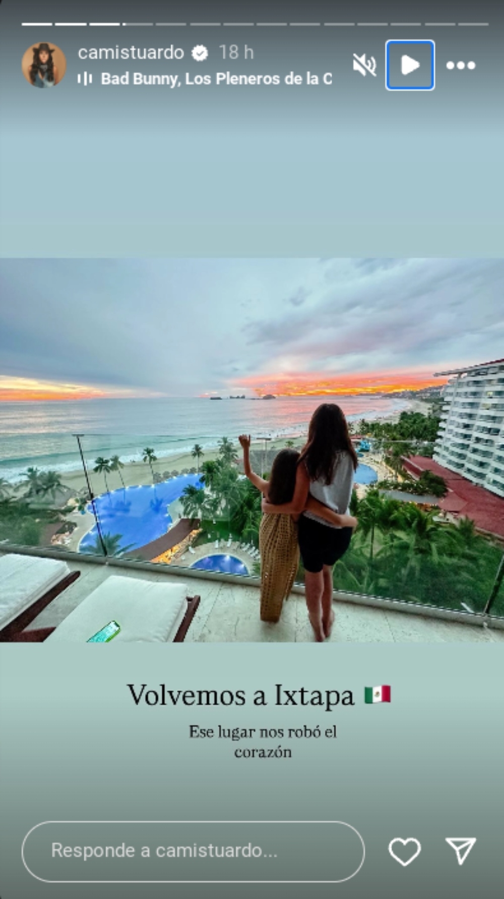 En sus historias de Instagram, la actriz nacional publicó una foto desde la suite de un hotel de playa con su hija. “Volvemos a Ixtapa. Este lugar nos robó el corazón”, escribió.