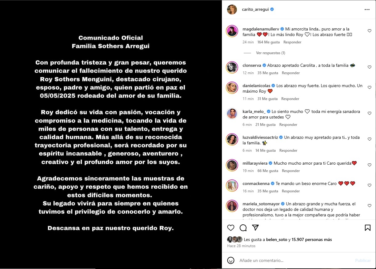 A través de la cuenta de Carolina Arregui, el círculo más cercano lamentó la muerte de Roy Sothers y le dedicó emotivas palabras. "Con profunda tristeza y gran pesar, queremos comunicar el fallecimiento de nuestro querido Roy Sothers Menguini, destacado cirujano, esposo, padre y amigo, quien partió en paz rodeado de su familia".