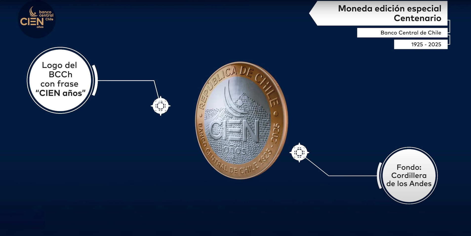 En el anverso de la moneda presentará el logo del Banco Central y la frase "CIEN años" en el centro, con "República de Chile" en el anillo. En la parte inferior del núcleo, se mostrará la Cordillera de Los Andes, y en la parte inferior del anillo, la frase "Banco Central de Chile 1925-2025".