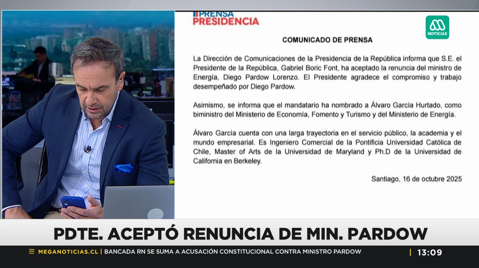 A través de un comunicado emanado desde Presidencia, se informó que "el Presidente de la República, Gabriel Boric Font, ha aceptado la renuncia del ministro de Energía, Diego Pardow Lorenzo. El Presidente agradece el compromiso y trabajo desempeñado".