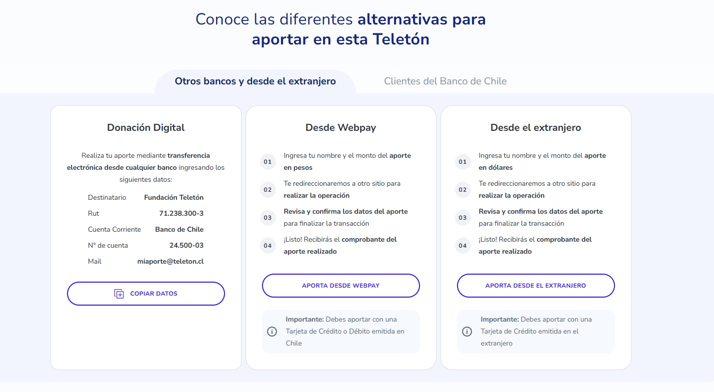 Quienes viven fuera del país pueden participar a través del sistema de donación internacional, que funciona de forma similar a Webpay, pero permite pagos en dólares. Solo deben ingresar sus datos, confirmar el monto y completar la transacción con una tarjeta de crédito emitida en el extranjero. Esto lo puedes hacer en la página oficial del Banco de Chile.