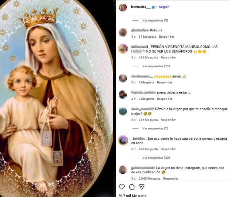 Aunque la publicación se llenó de palabras de apoyo para Fran Maira, también recibió algunos comentarios críticos por su tono espiritual. Ahora la artista defiende su forma de sobrellevar esta complicada situación apoyándose en la religión.