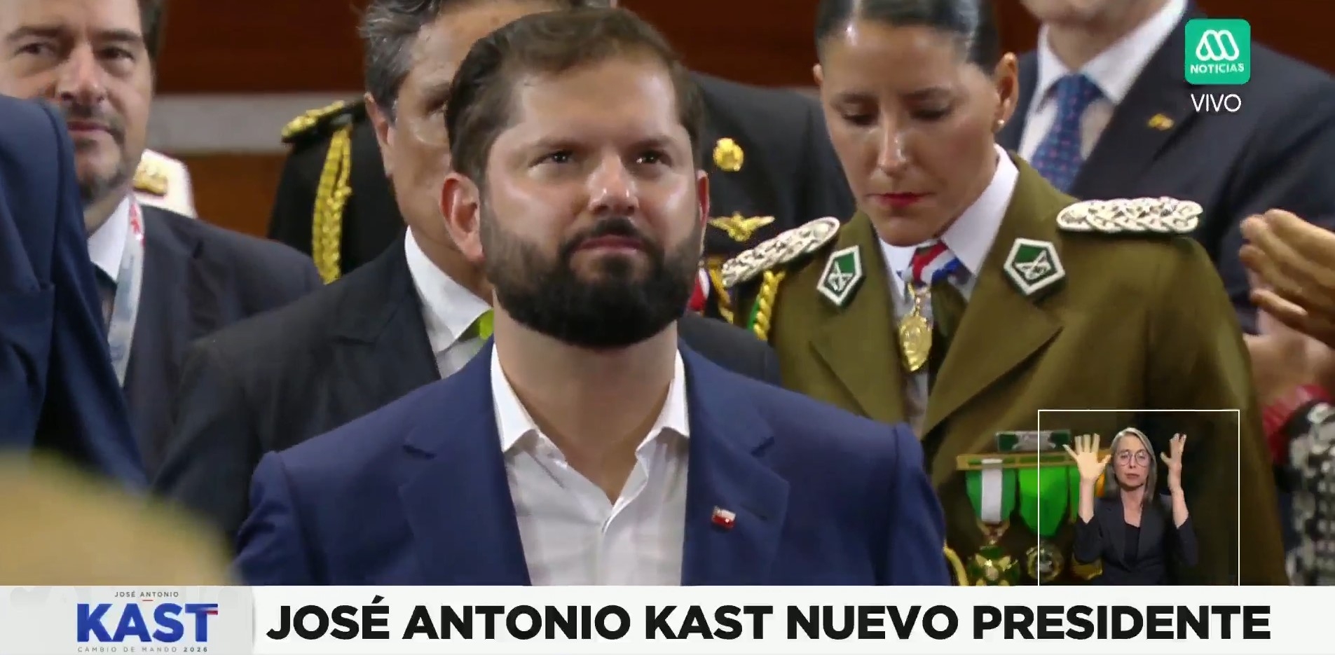 A las 12:30 horas de este miércoles 11 de marzo, José Antonio Kast se convirtió oficialmente en el nuevo Presidente de la República de Chile, luego de jurar y recibir la banda presidencial y piocha de O'Higgins por parte de Gabriel Boric.