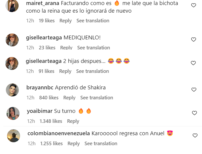 “Karol G, regresa con Anuel”; “Ahora es su turno”; “Aprendió de Shakira”; “Dos hijas después”; “Muero por saber qué piensa Yailin de todo esto”, fueron algunas de las reacciones dejadas en la publicación del cantante.