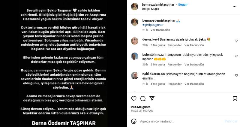 La esposa del actor, Berna Ozdemir, escribió un sentido mensaje en Instagram para su esposo, que se encuentra sedado y entubado, en espera de su reacción.