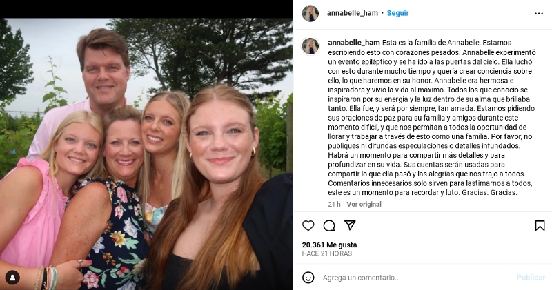 En la cuenta de Instagram de la joven, con 76 mil seguidores, la familia escribió un mensaje para detener las especulaciones. “Annabelle experimentó un evento epiléptico y se ha ido a las puertas del cielo. Ella luchó con esto durante mucho tiempo y quería crear conciencia sobre ello, lo que haremos en su honor”, escribieron.