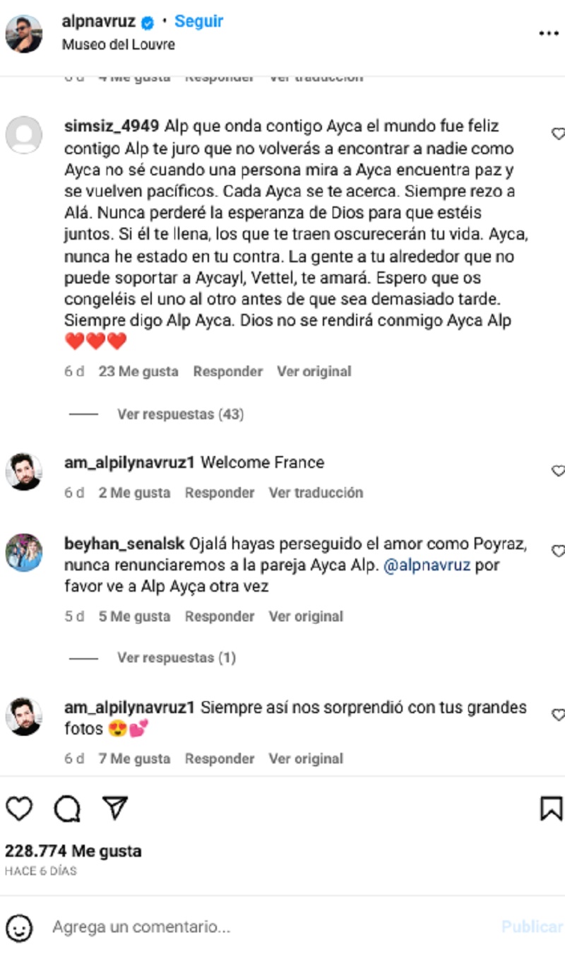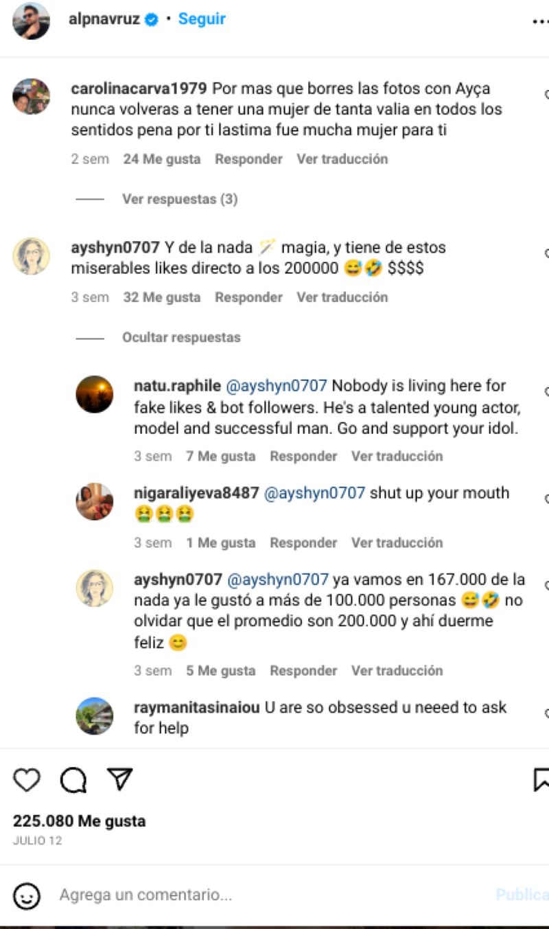 “Ayça fue demasiado para ti”; “Te juro que no volverás a encontrar a alguien como Ayça”; “Por más que borres las fotos con Ayça, nunca volverás a tener una mujer de tanta valía”; “¿Por qué engañaste a Ayça? Era súper atractiva y hermosa”; “¡Alp! Vuelve con Ayça, por favor”; “Es la chica más hermosa y mejor del mundo”; “No puedo creerlo”, son algunos de los mensajes.