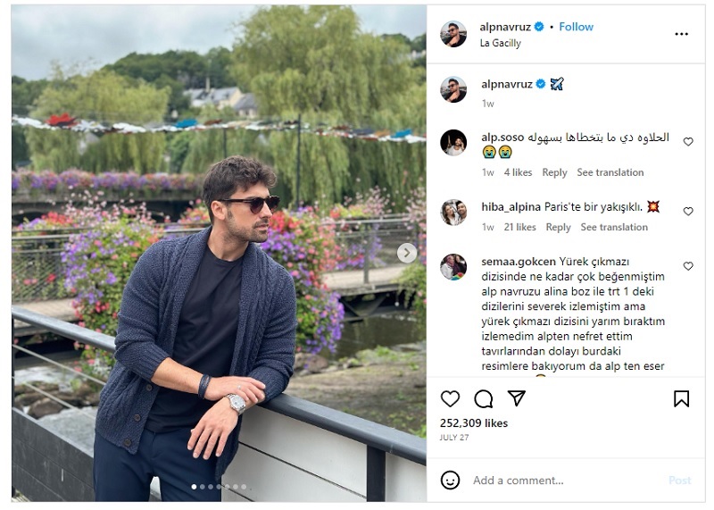 El actor y modelo turco recibió gran cantidad de críticas luego de publicarse la foto de su nuevo romance. En sus post de Instagram recibe comentarios negativos, la mayoría se refieren a su nueva relación y defienden la belleza e inteligencia de su ex.