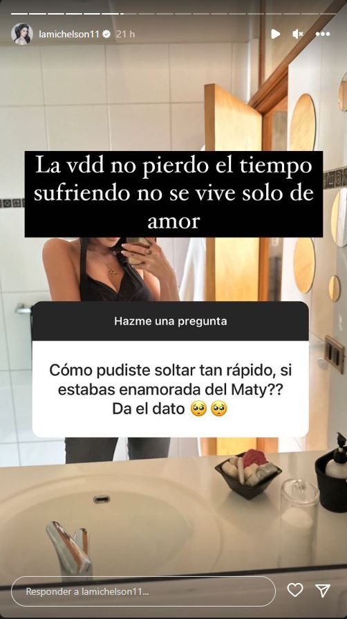 "La verdad no pierdo tiempo sufriendo, no se vive solo de amor", respondió la exchica reality.