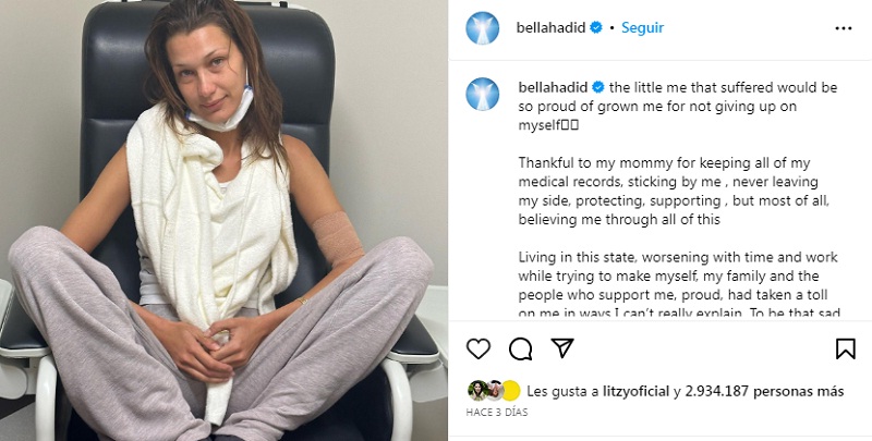 En su cuenta de Instagram, con más de 50 millones de seguidores, Bella relató su experiencia durantes los más de 100 días que duró el tratamiento que la sanó de la infección crónica que padecía.