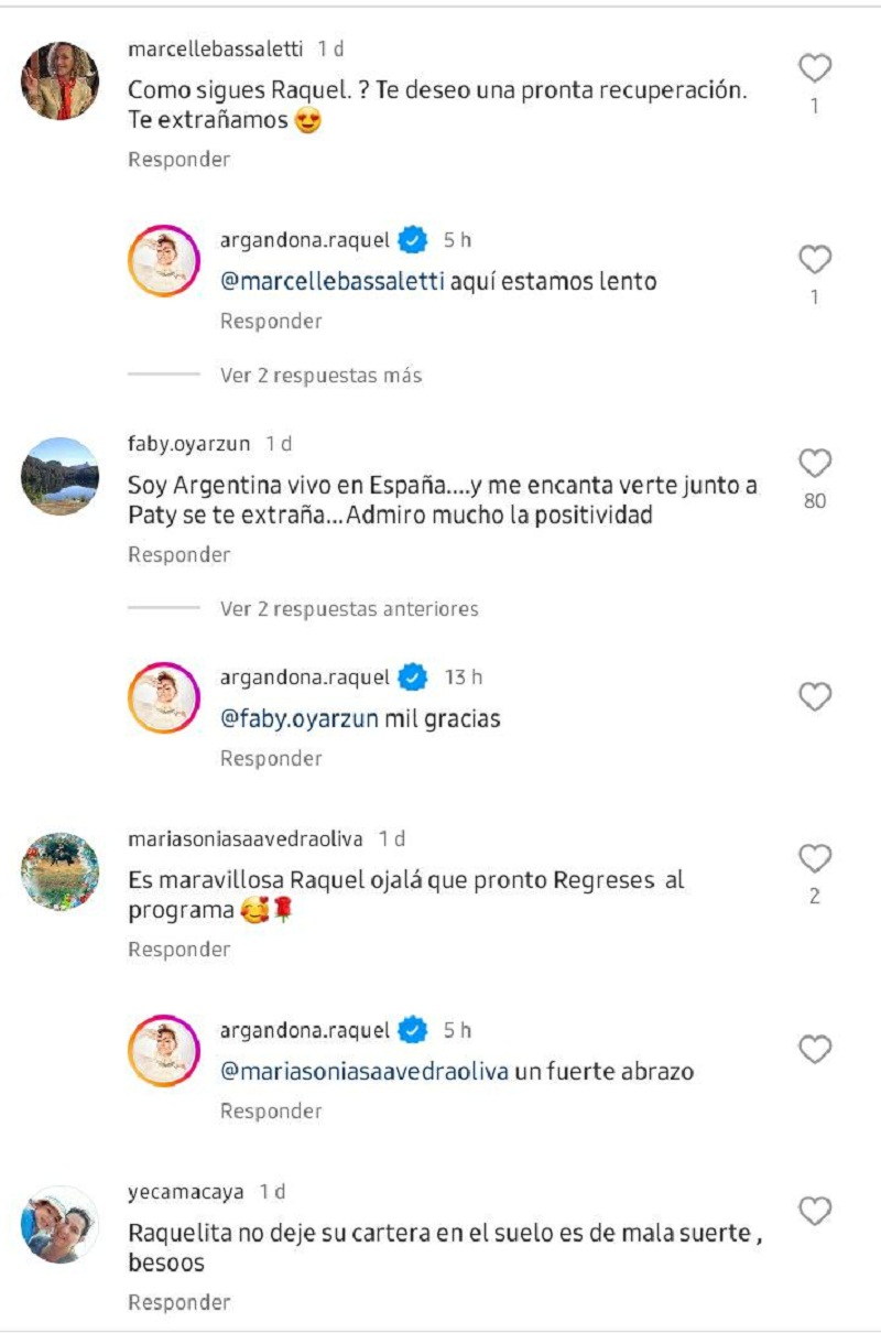 La reacción de los seguidores de Argandoña fue inmediata: “Me encanta verte, se te extraña. Admiro mucho la positividad”; “Te deseo una pronta recuperación. Te extrañamos”; “Me alegro mucho que estés recuperada, extrañaba mucho tus publicaciones”; “Que se recupere pronto, se le extraña muchísimo”.