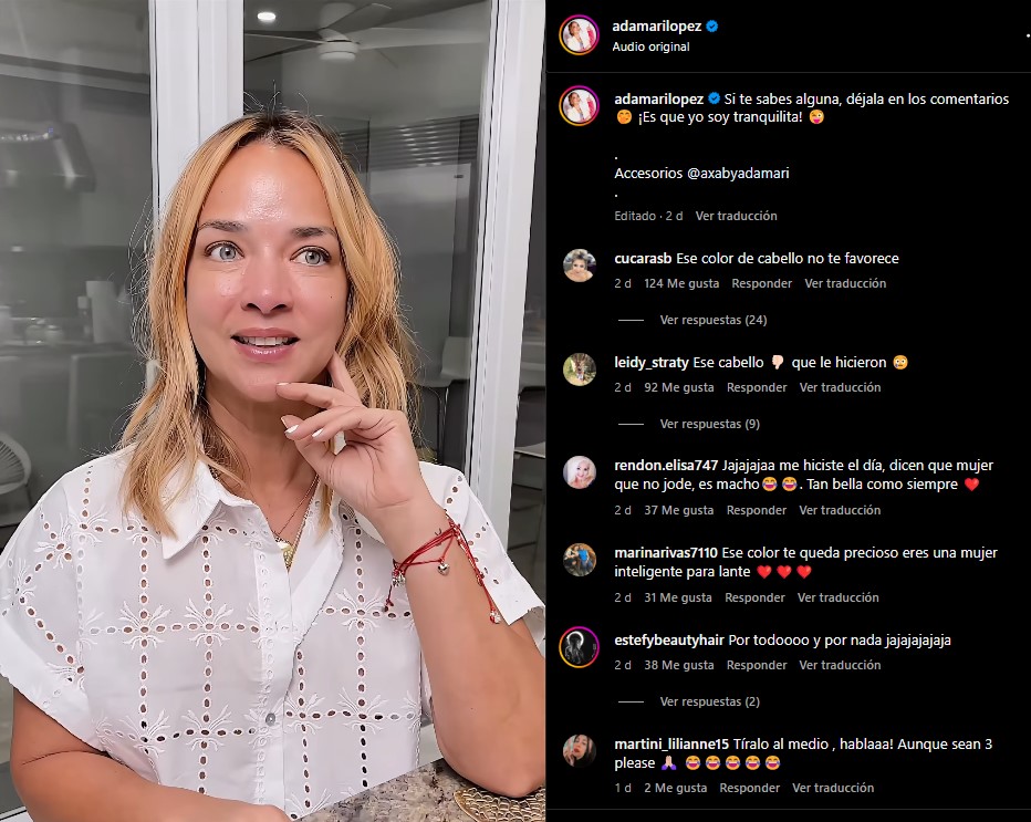 “Bello tu pelo, no te lleves de las amargadas que se lo han puesto y nada, no le va. Por eso critican a las que sí le queda bonito”; “Qué preciosa eres, sigue que todo lo haces bien y bonito”; “Tan linda mi chiquita”; “Ese color de pelo te queda muy lindo”; “Me encanta tu cabello”; son algunos de los halagos que recibió Adamari por su look.