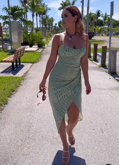 La esposa del exfutbolista se vio relajada mientras grababa un clip promocional para anunciar el primer programa de su segunda temporada. En medio del sol de la Florida, se lució desfilando un vestido midi verde menta, con escote corazón y corpiño drapeado.