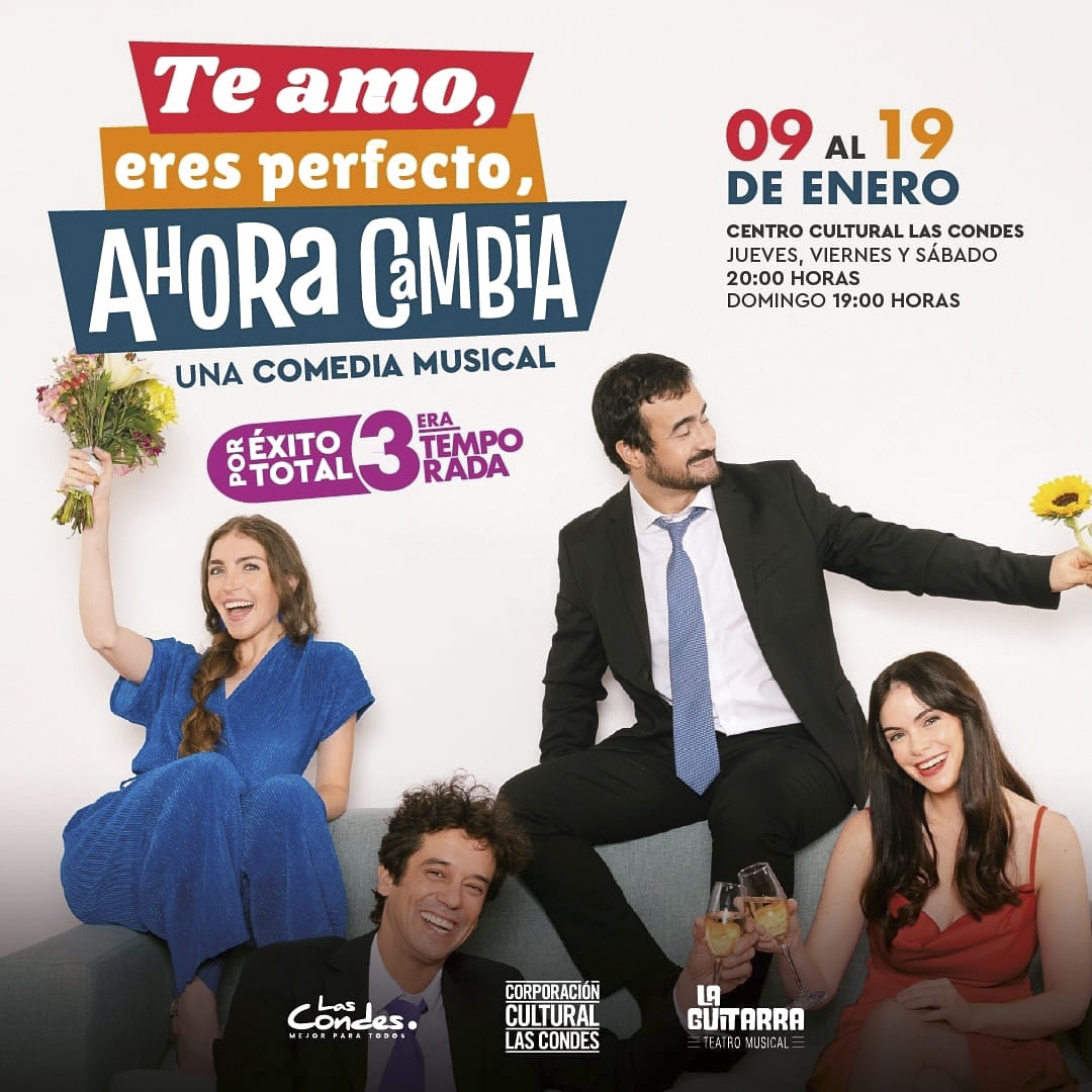 Esta adaptación oficial de “Te amo, eres perfecto, ahora cambia” es producida por la Corporación Cultural de Las Condes y La Guitarra Producciones y dirigida por el reconocido actor nacional Felipe Contreras. Cuenta con un elenco estelar integrado por Matías Oviedo, Milagros Andaluz, Bernardita Nassar y Osvaldo Iturriaga. Además, cada una de las presentaciones incluye música en vivo, haciendo de este un show único para disfrutar en pareja, o con amigos.