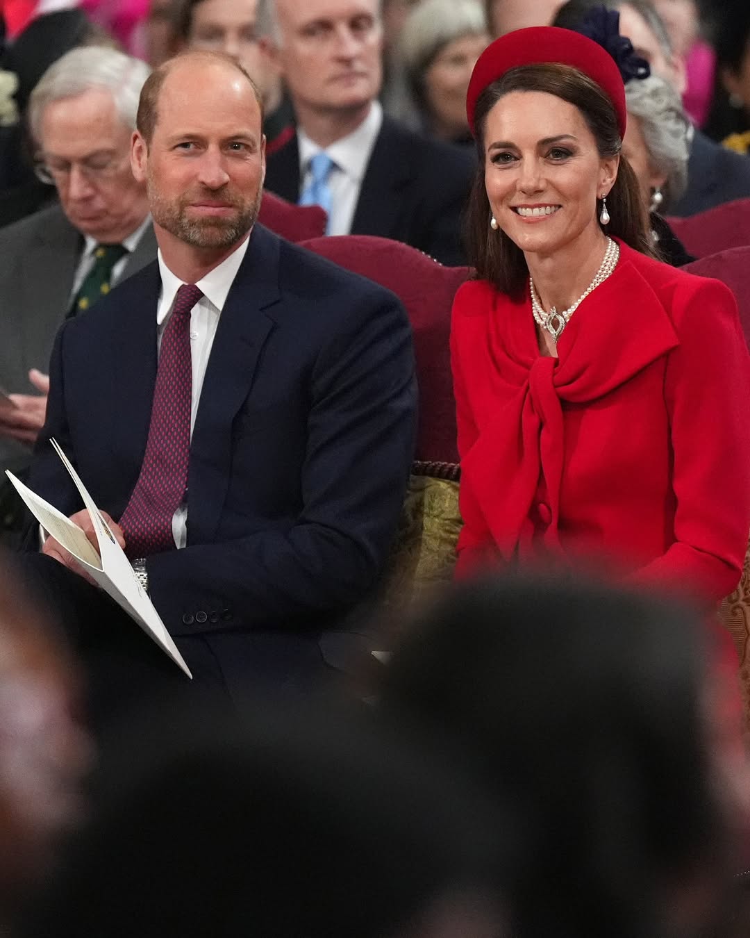 Kate Middleton no estrenó para esta celebración, y por el contrario echó mano de la moda circular al lucir un look marcado por el vibrante color rojo carmesí. La madre de tres niños recicló el vestido abrigo firmado por la diseñadora Catherine Walker & Co, con el que celebró las fiestas de Navidad de 2021.