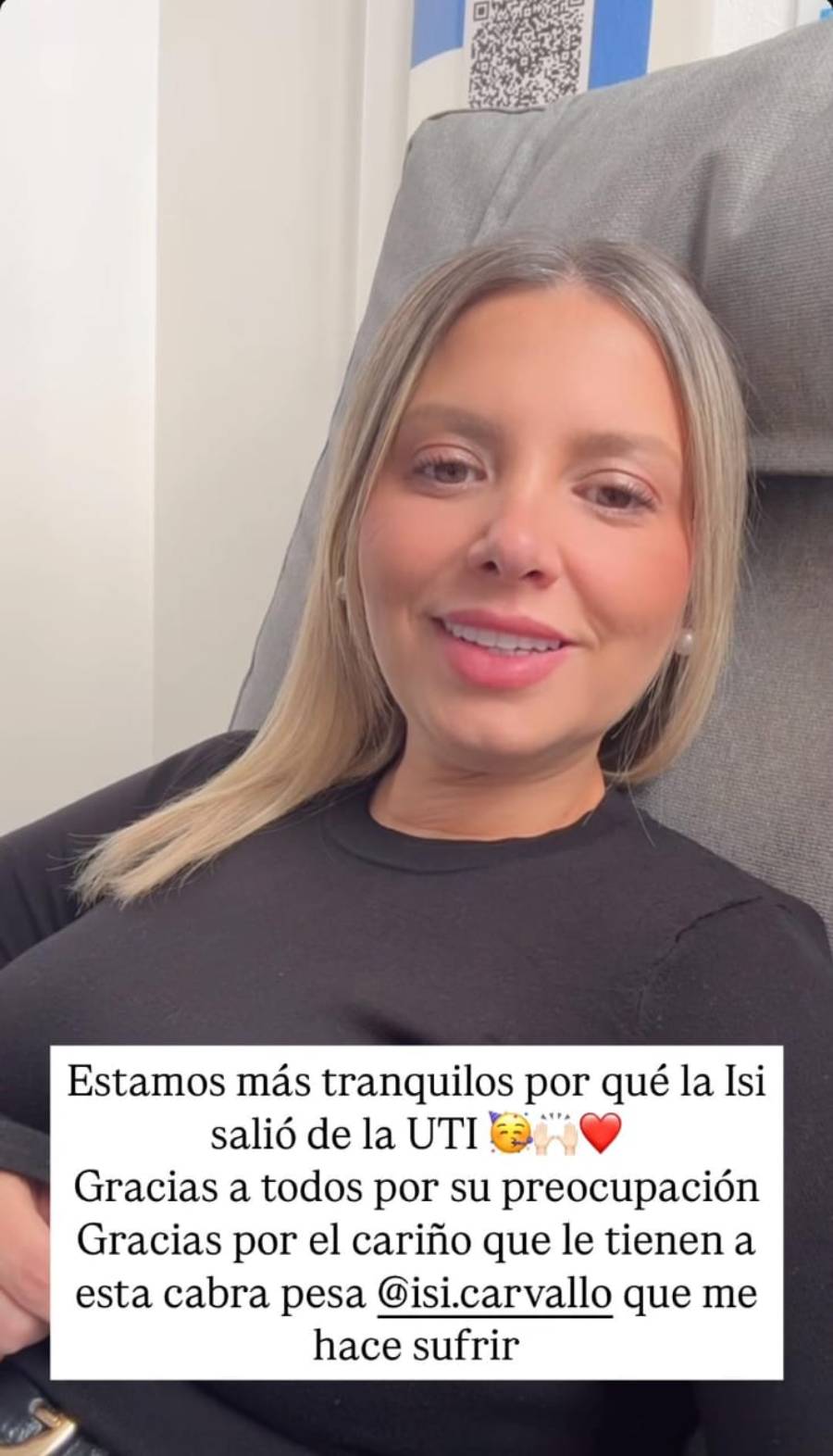 “Aquí estamos acompañando a la Isi, ¡y les tengo buenas noticias, porque salió de la UTI!”, expresó alegre la ex Mekano en la historia que compartió con sus más de 280 mil seguidores.