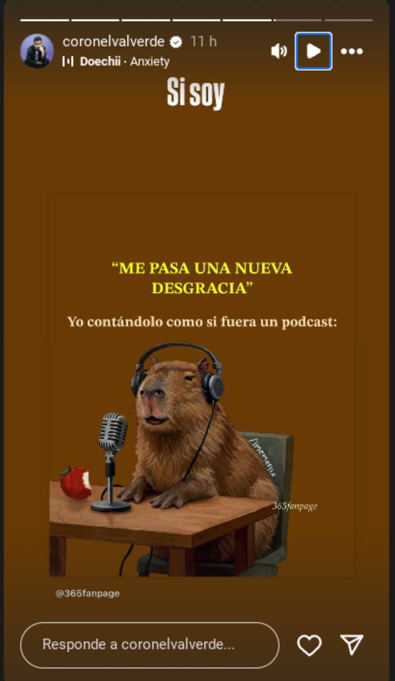 Además, dejó evidencia del humor que lo caracteriza, con una historia en la que ironiza con su situación. "Me pasa una desgracia. Yo contándolo como si fuera un pódcast", se lee en la publicación.