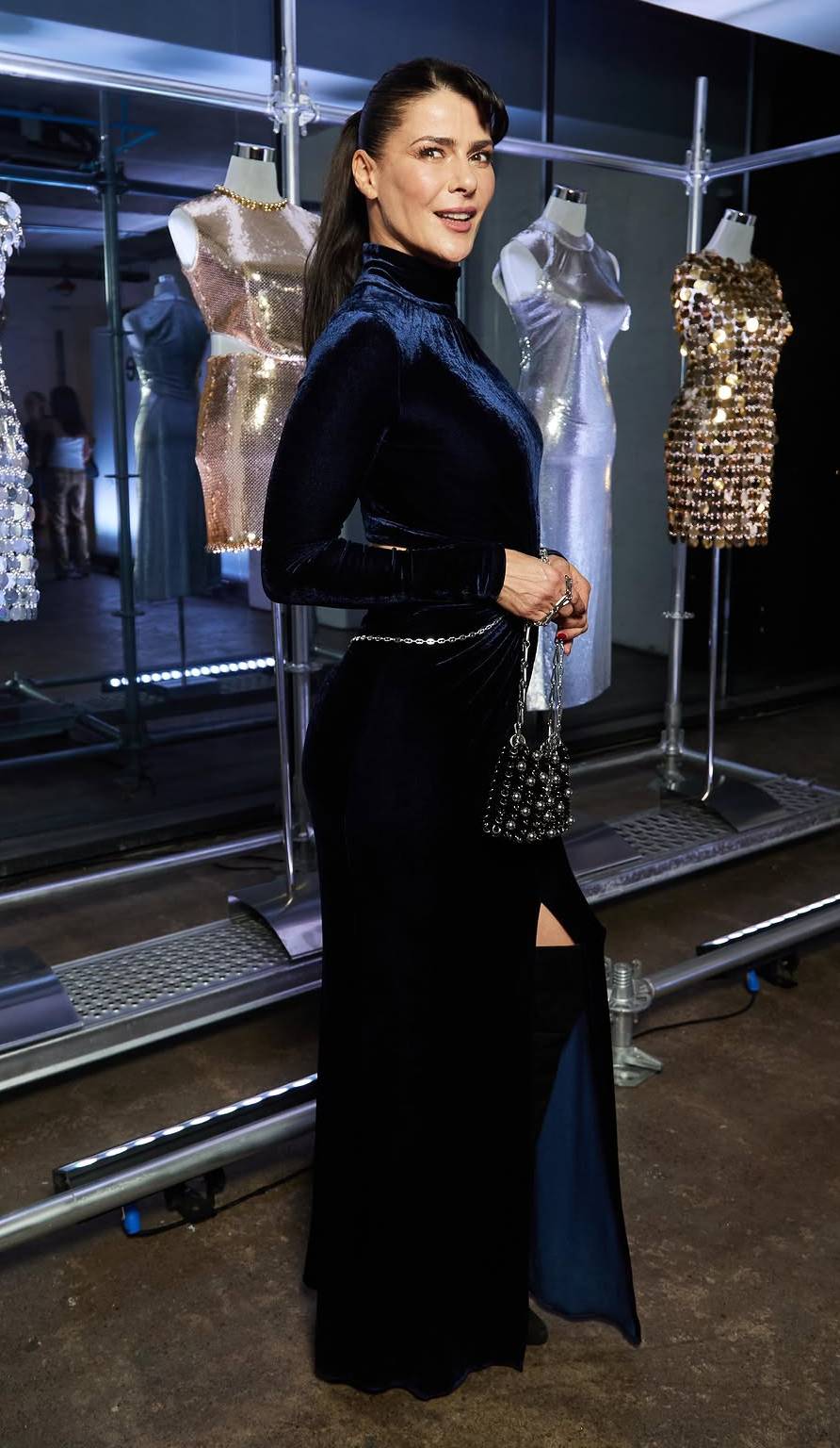 Una vez maquillada en delicados tonos rosa, mostró su imponente look completo: vestido de terciopelo azul, con cuello elevado y mangas largas, cut out en la cintura. Llevó el cabello recogido en una cola de caballo y el flequillo armado, en una selección elegante y sofisticada.