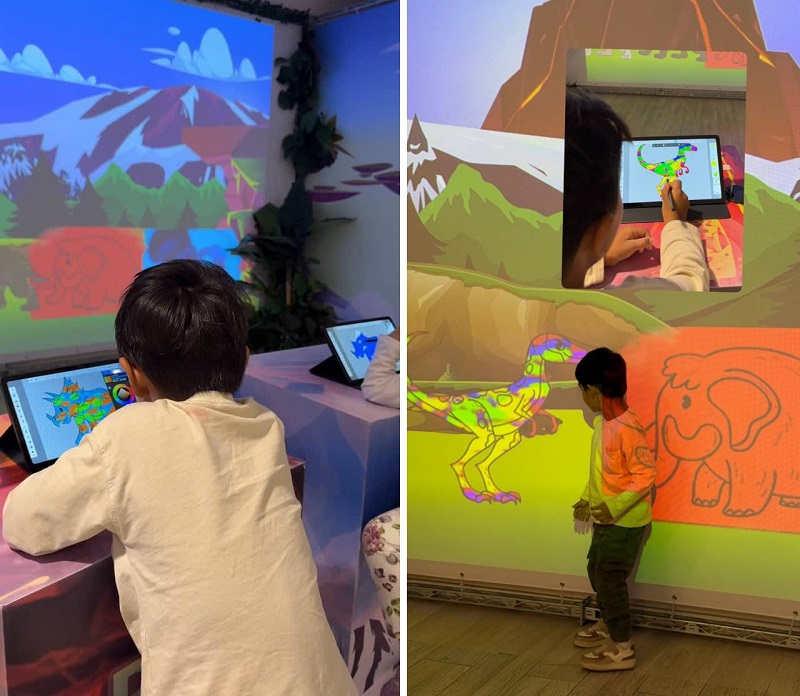 A los hermanitos también se les vio colorear dinosaurios en unas tablets con lápices ópticos, para darles vida a los animales que aparecen en la pantalla y luego verlos proyectados en la pared.