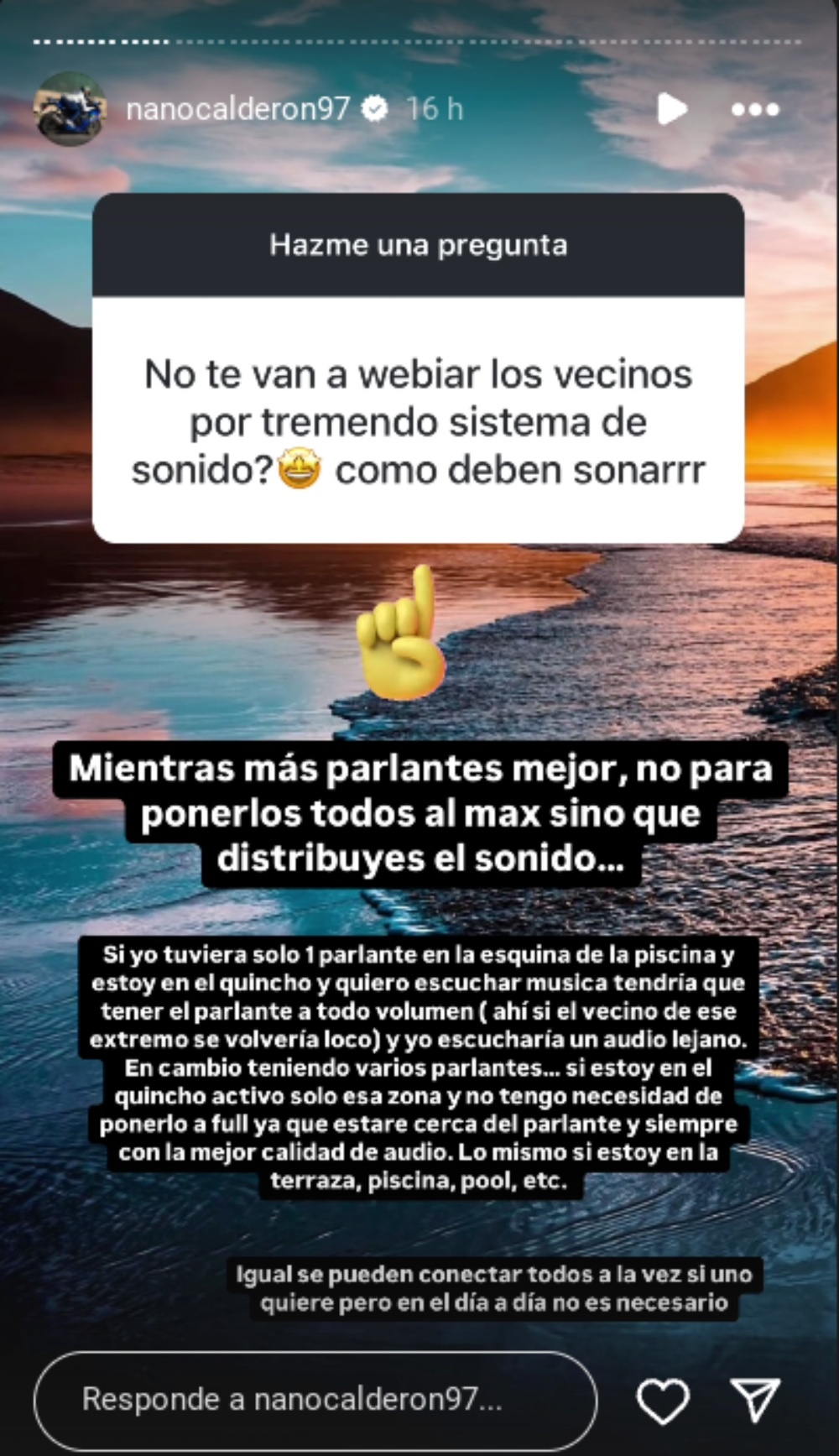 “Mientras más parlantes mejor. No para ponerlos todos al máximo, sino que distribuyes el sonido. Si tuviera un solo parlante en la esquina de la piscina, estoy en el quincho y quiero escuchar música tendría que tener el parlante a todo volumen. Ahí sí, el vecino de ese extremo se volvería loco”, explicó cuando le preguntaron si el volumen molestaría a los residentes del área.