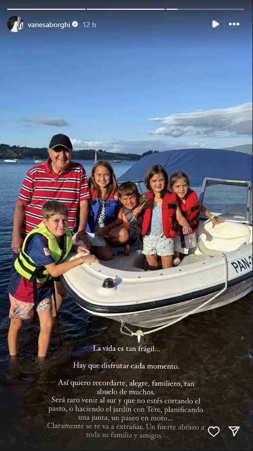 "Así quiero recordarte, alegre, familiero, tan abuelo de muchos. Será raro venir al sur y que no estés cortando el pasto o haciendo el jardín con Tere, planificando una junta o paseo en moto", escribió.