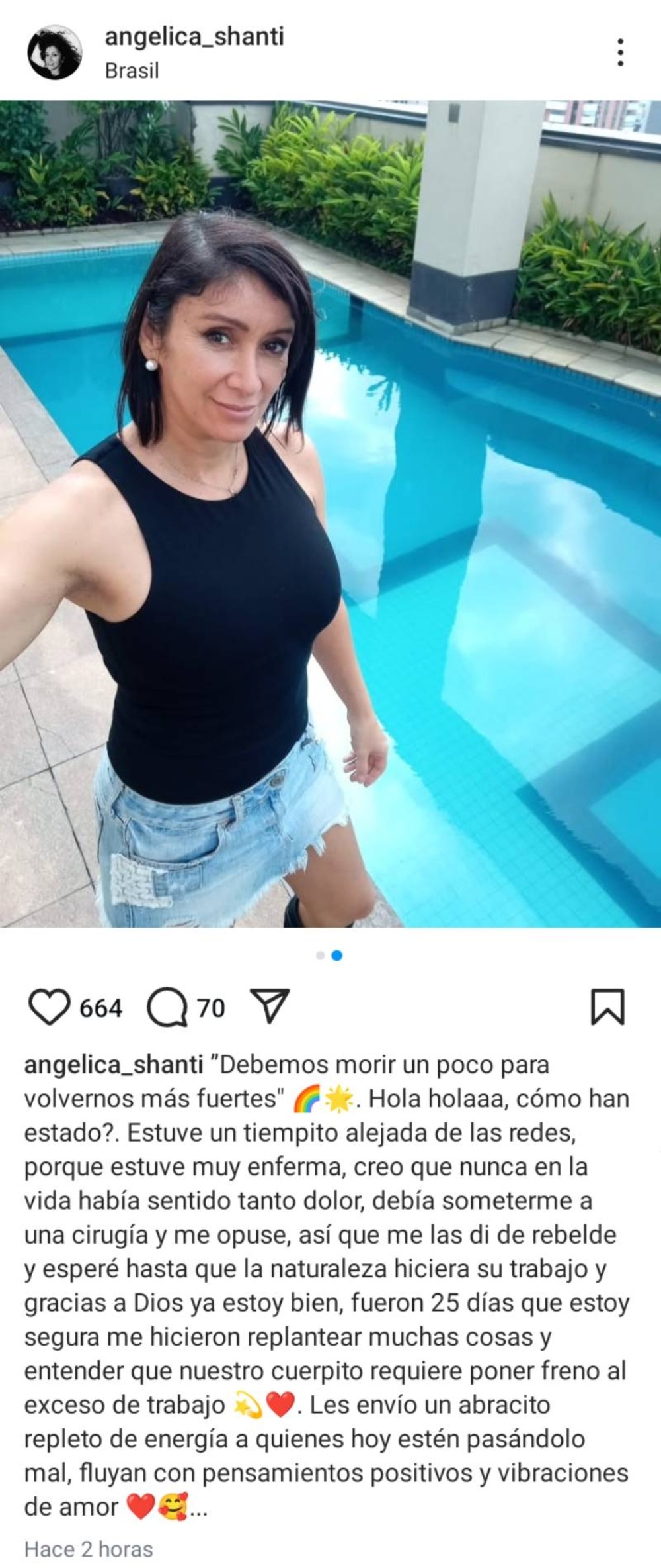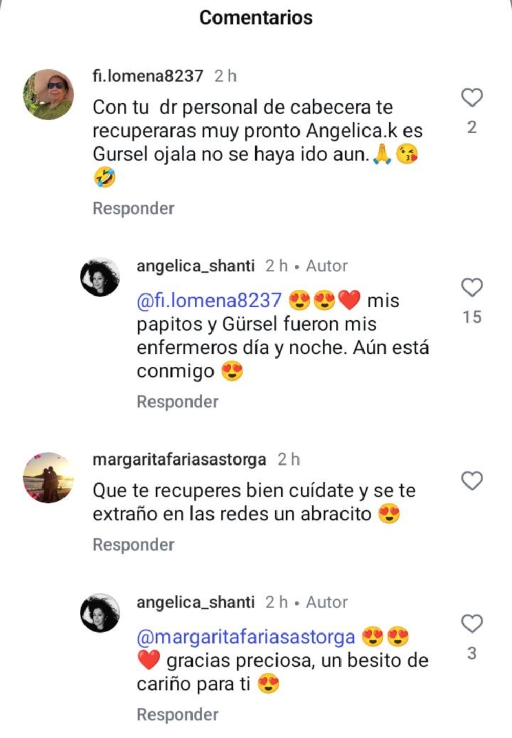 Al poco tiempo el post recibió cientos de reacciones de sus seguidores, quienes dejaron comentarios como: “Que te recuperes bien. Cuídate, se te extrañó en las redes. Un abrazo” y “con tu doctor personal Gursel te recuperarás muy pronto, Angélica. Ojalá no se haya ido aún”.