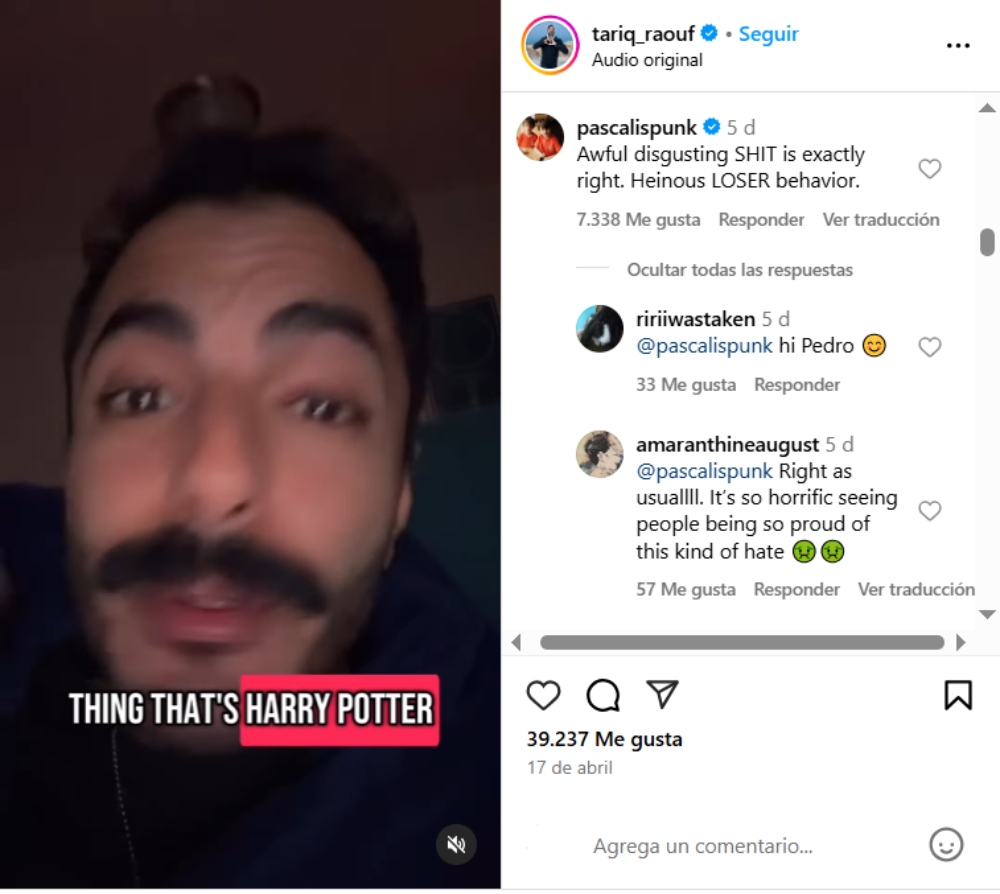 En un video donde el activista Tariq Ra’ouf juzga la publicación de la autora británica en Instagram, Pascal reaccionó con un mensaje: “Lo de ‘mierda, horrible y desagradable’ es exacto. Es un comportamiento de perdedora atroz”.