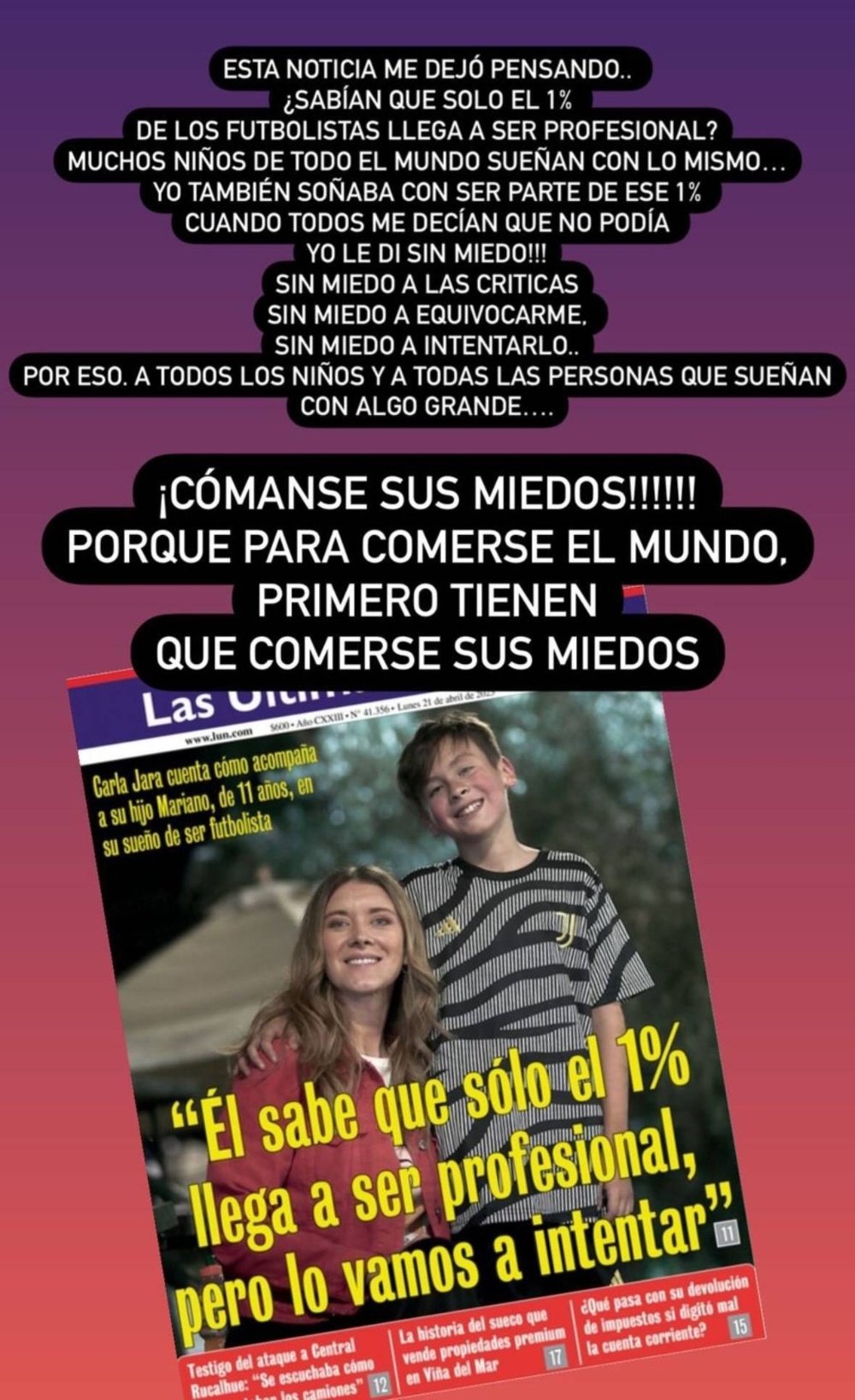 “Esta noticia me dejó pensando. ¿Sabían que solo el 1% de los futbolistas llega a ser profesional? Muchos niños de todo el mundo sueñan con lo mismo”, escribió.