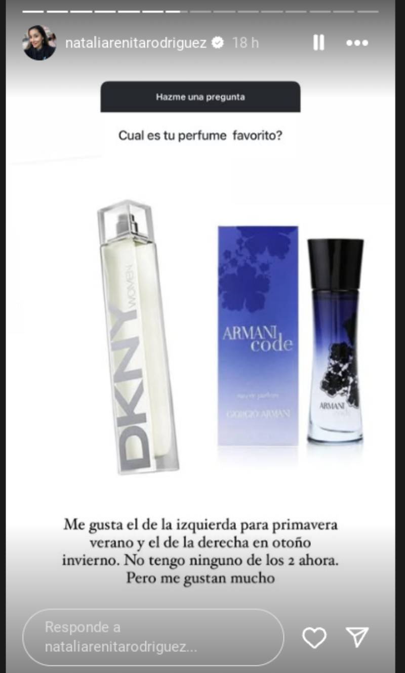 En una foto, incluyó las dos marcas que más disfruta. “Me gusta el de la izquierda para primavera-verano y el de la derecha en otoño-invierno. No tengo ninguno de los dos ahora, pero me gustan mucho”. El primero es el DKNY Women Donna Karan, un perfume en el que predominan notas cítricas florales