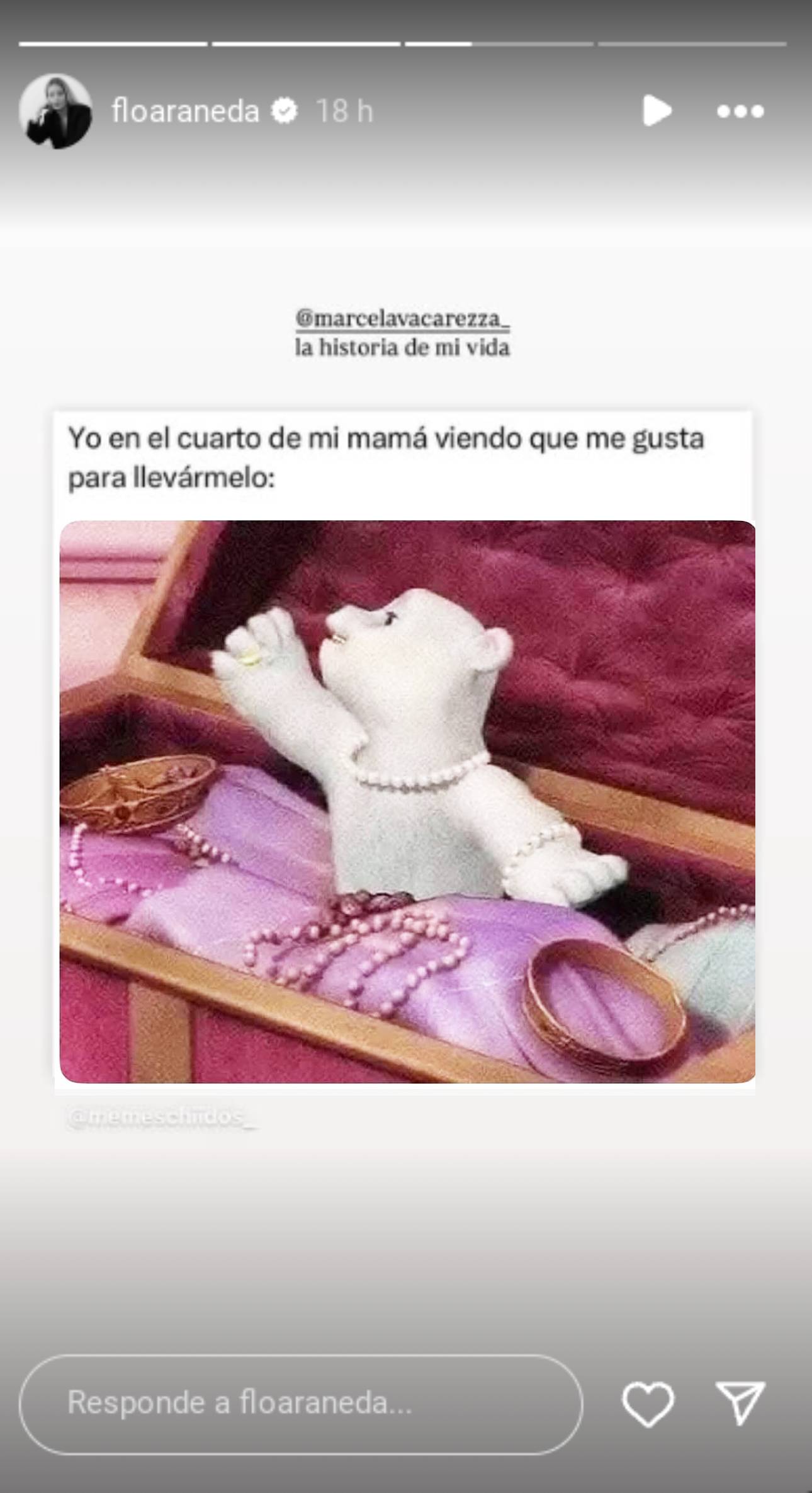 “La historia de mi vida”, escribió la joven influencer para confesar que revisa el clóset y el joyero de Marcela Vacarezza en busca de algún “tesorito” para llevarse a su departamento.