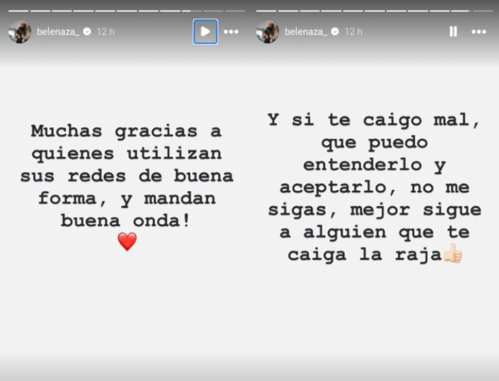 Finalmente, Belén elogió a quienes utilizan las redes “de buena forma y mandan buena onda”, mientras que a los 'haters' les dedicó una reflexión: “Y si te caigo mal, que puedo entenderlo y aceptarlo, no me sigas. Mejor sigue con alguien que te caiga la raja”.