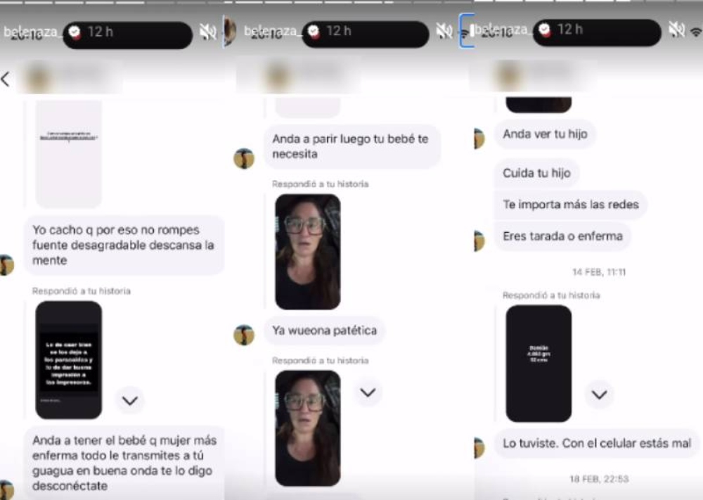 “Anda a parir luego, tu bebé te necesita”; “Ya wueona patética”; “Cuida a tu hijo”; “Te importan más las redes”; “¿Eres tarada o enferma?”; son algunos de los mensajes que mostró Belén.