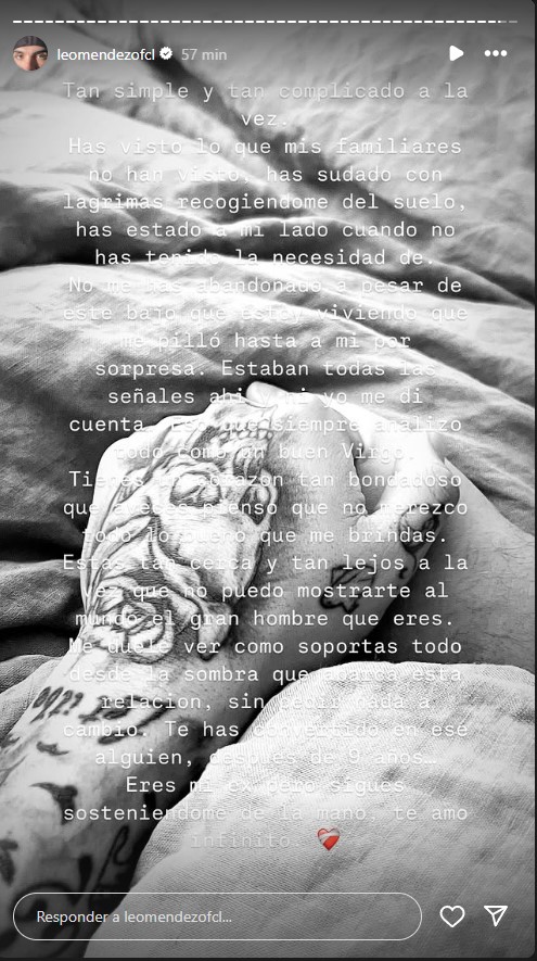 Una de las últimas historias que subió Leo Méndez a su cuenta de Instagram fue dedicada a su expareja, quien pese a que ya no tienen un vínculo amoroso, ha estado presente en sus momentos más complejos.