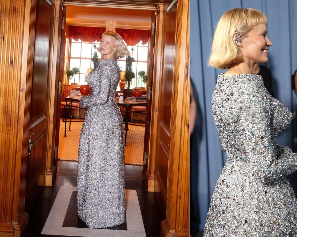 La artista se vistió con un diseño firmado por Tory Burch, adornado por miles de gemas y diamantes reciclados, cumpliendo así con el código de vestimenta de esta edición. El traje de escote barco y mangas largas esculpió un corpiño y su cintura, dejando una falda estructurada en una burbuja en el área de las caderas.