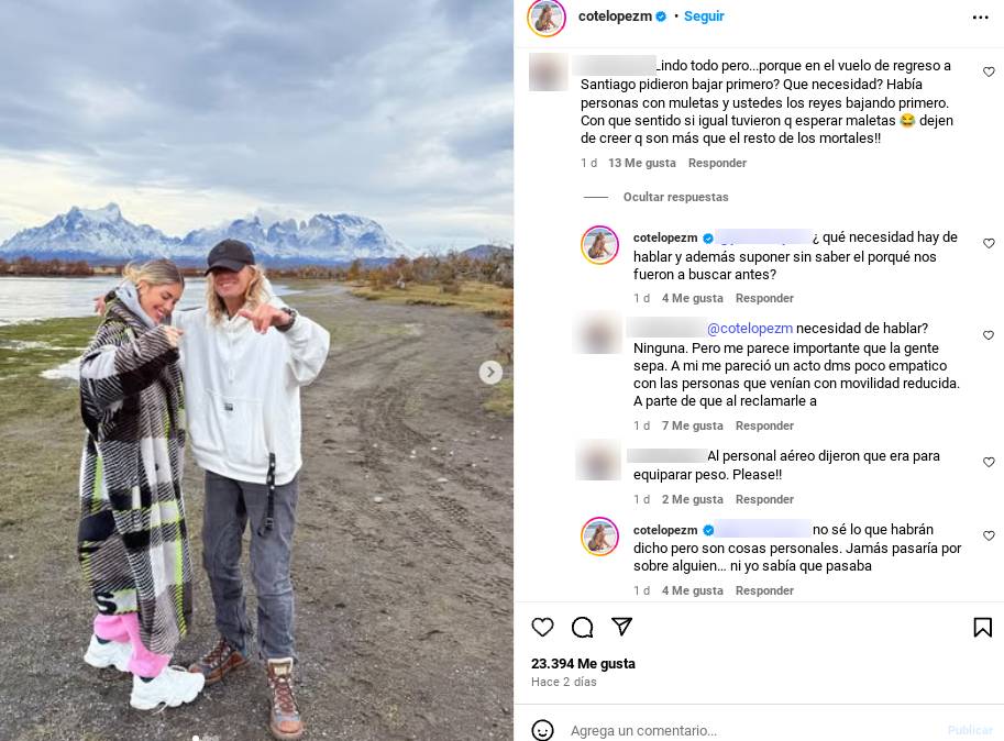 “Lindo todo, pero… ¿por qué en el vuelo de regreso a Santiago pidieron bajar primero?”, fue la acusación que recibió Coté en unas postales que publicó, en las que posaba en medio de la escena patagónica junto a su padre, Gonzálo López, y su hijo menor, Jesús.