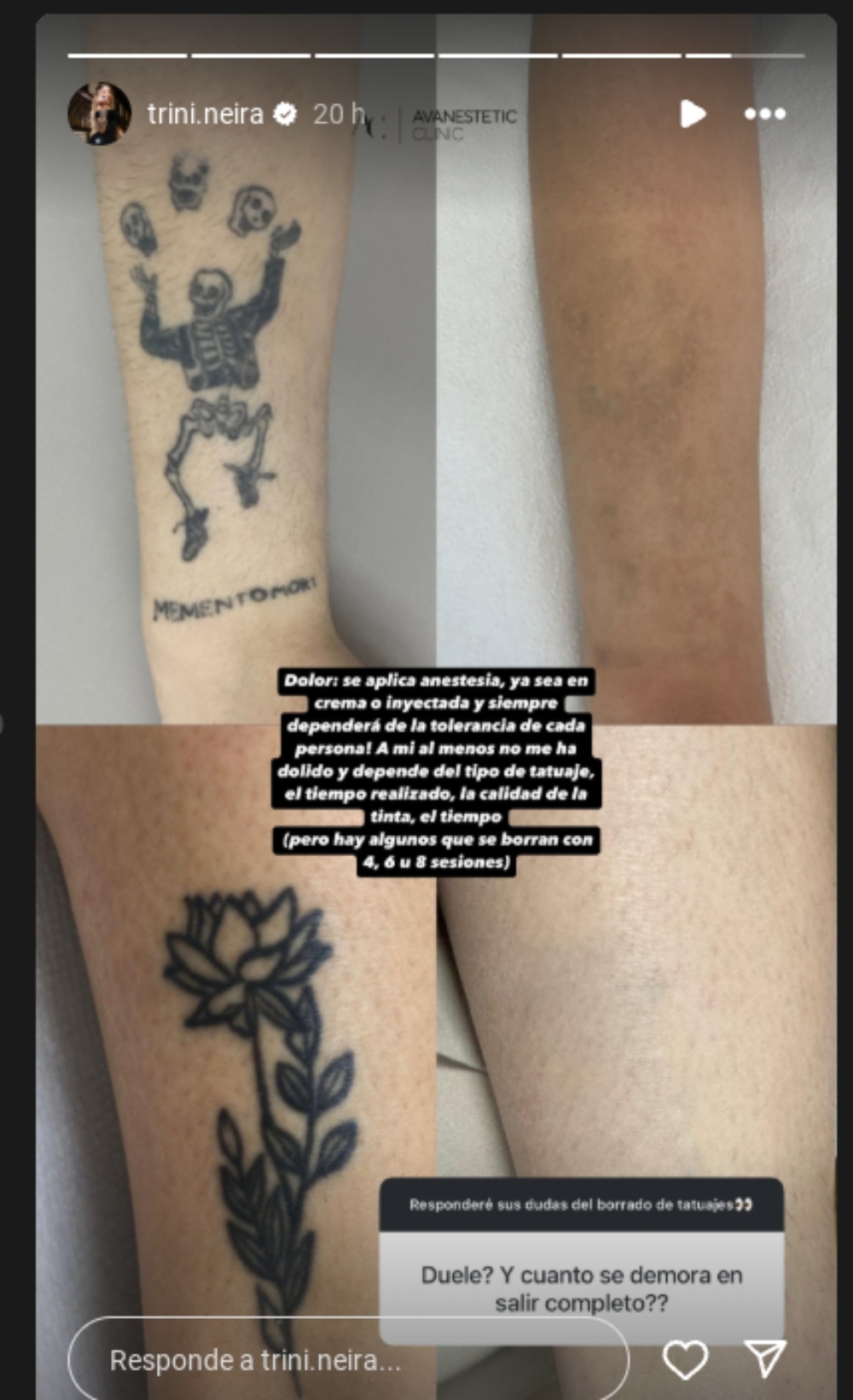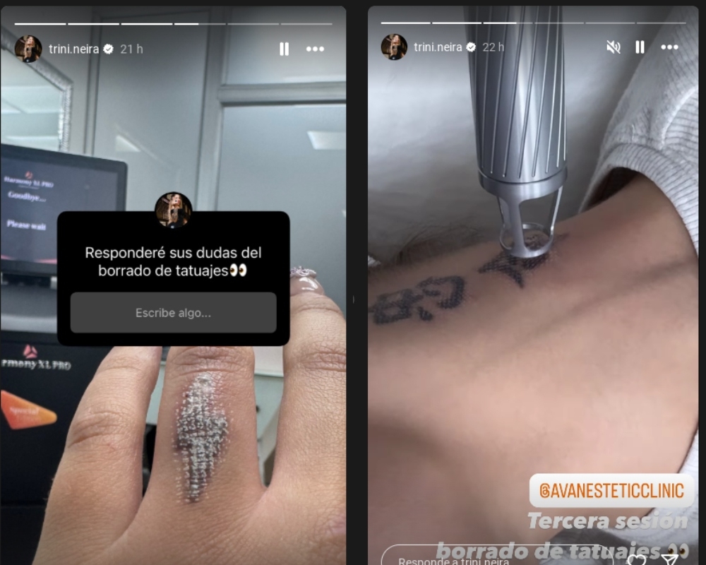 En sus historias de Instagram, la creadora de contenidow publicó varias fotos de la tercera sesión de borrado, donde responde las dudas de sus seguidores, a la vez que muestra las cicatrices que le deja el tratamiento. "¿Duele? ¿Cuánto se demora en salir completo?", quiso saber un internauta.