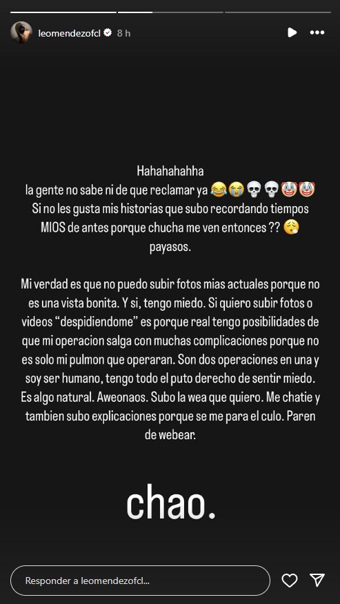 Debido a esto, Leo Méndez realizó un fuerte descargo en su cuenta de Instagram: "La gente no sabe ni de qué reclamar ya. Si no les gusta mis historias que subo recordando tiempos míos de antes, por qué chu... me ven entonces, payasos".