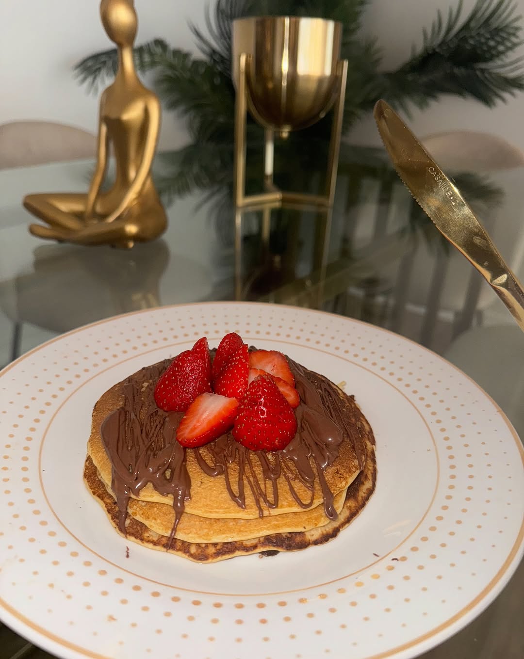 Así despertó a su niña y le preparó un desayuno digno de la “realeza”, unos pancakes cubiertos de chocolate y frutillas, junto a un vaso de leche.
