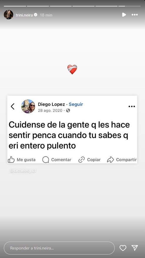 En la historia de Instagram que compartió durante la tarde de este lunes 12 de mayo, Trini Neira no etiquetó a nadie ni se refirió a ninguna persona en específico.