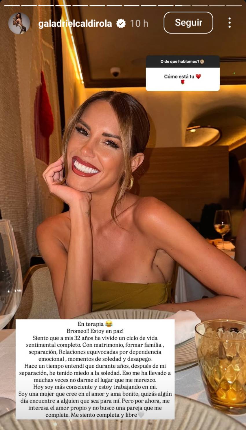 Caldirola destacó que, por estas razones, ahora trabaja en su amor propio, en un proceso que describió como liberador en su publicación: "No busco una pareja que me complete, me siento completa y libre".