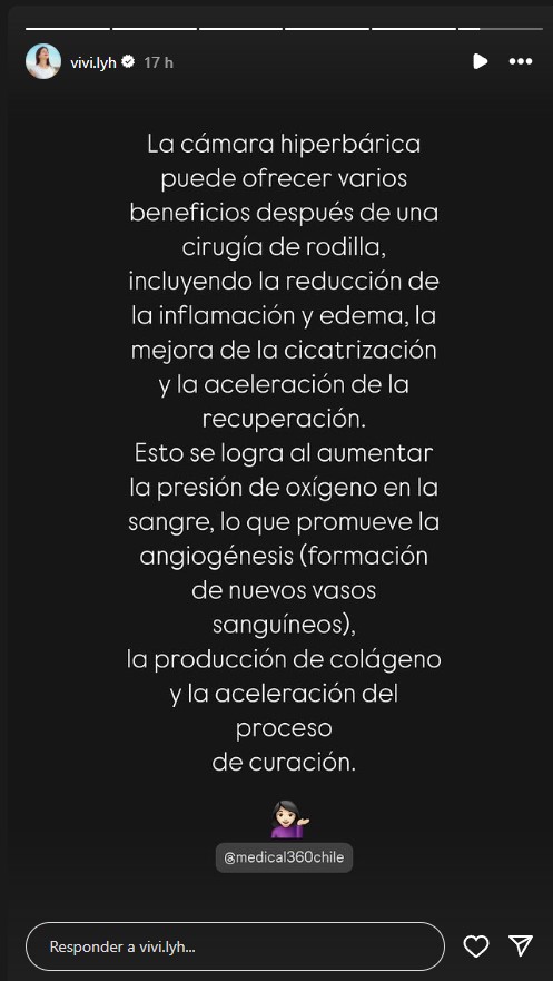 Casi dos meses han pasado de la intervención y ahora, Vivi Rodrigues mostró el novedoso tratamiento que se hizo en su rodilla. Ingresó a una cámara hiperbárica la cual tiene propiedades regenerativas.