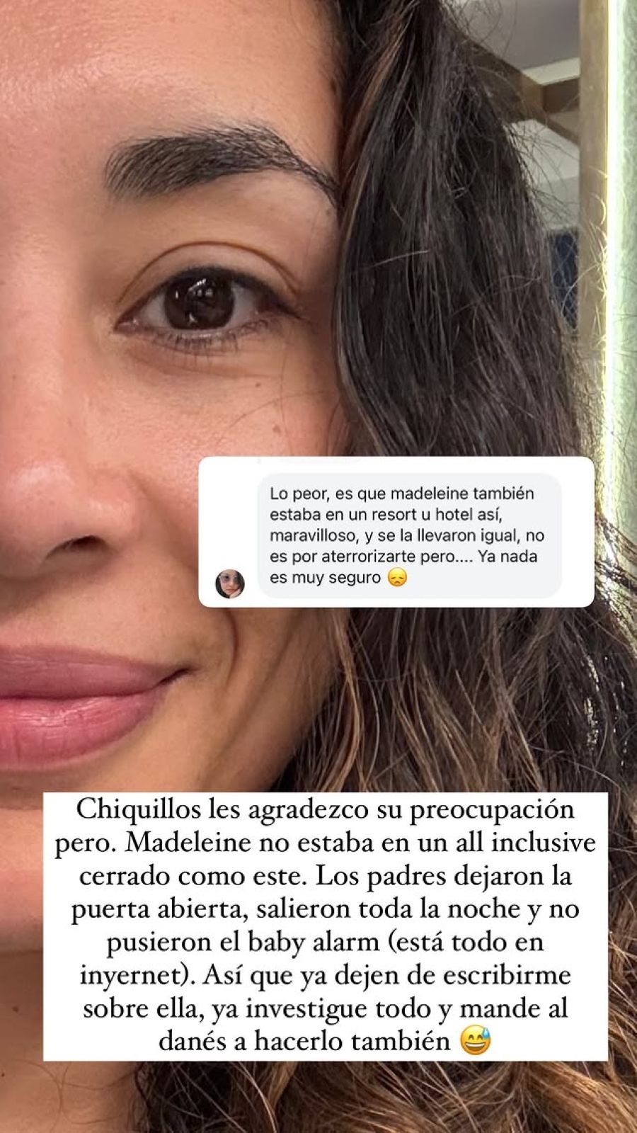 “Les agradezco su preocupación, pero Madeleine no estaba en un all inclusive cerrado como este, los padres dejaron la puerta abierta… y no pusieron la baby alarm”, respondió "Arenita" a quienes le recordaron la desaparición de la niña inglesa en 2007, en un hotel de Portugal.
