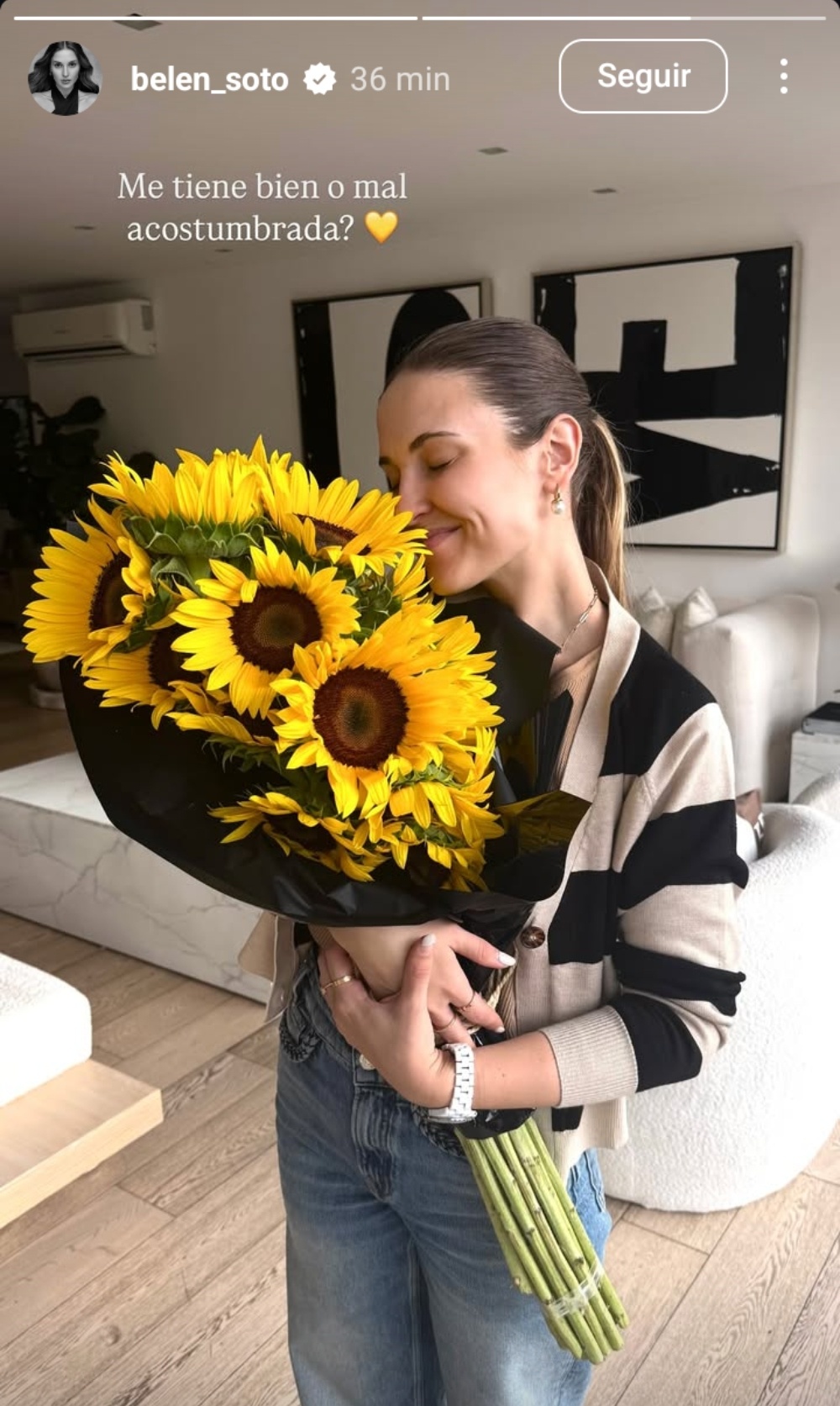 La modelo y escritora nacional compartió una foto donde aparece sosteniendo un enorme ramo de girasoles, con sus tallos largos y un elegante envoltorio de papel negro. En la imagen se ve a Belén sonriente, con los ojos cerrados mientras percibe el aroma de las flores con expresión de mujer enamorada.