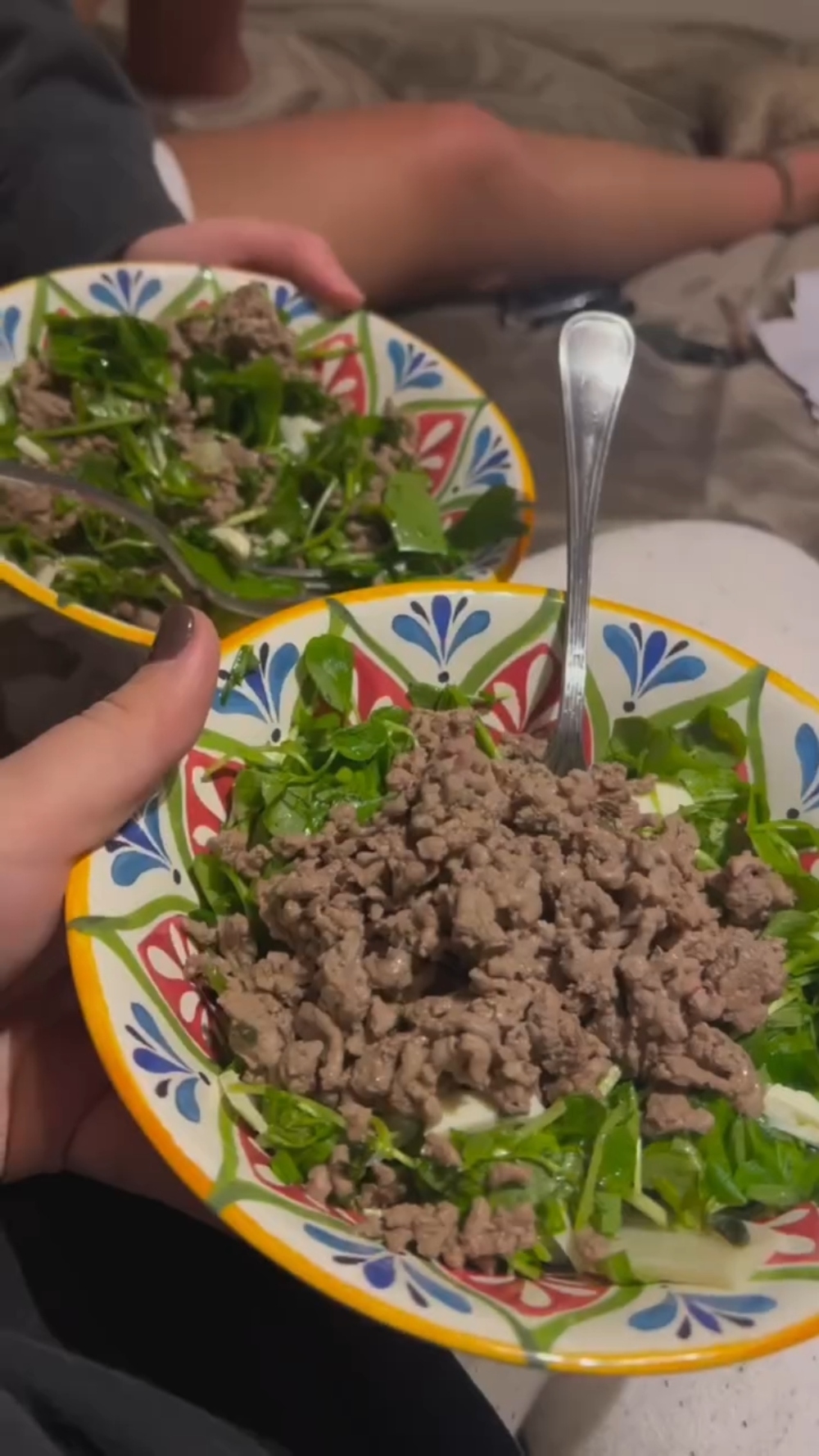 "En la noche le hice la misma ensalada que había almorzado, porque le encantó. Es carne molida con rúcula, berro y queso parmesano. Le puse otro quesito, que es queso palmita, y estaba increíble”, contó.