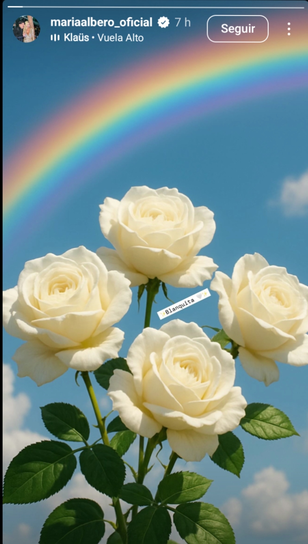 La esposa de Iván Zamorano posteó en sus historias de Instagram una foto de un ramo de rosas blancas en el cielo, con un arcoiris al fondo. “Blanquita”, fue lo único que escribió sobre la imagen, seguramente en alusión a la primera hija de sus amigos.