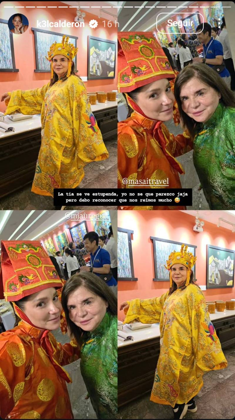 En sus historias de Instagram, Calderón publicó algunas fotos en las que ella y Jáuregui posan con atuendos tradicionales llenos de detalles dorados y rojos, y sombreros extravagantes.