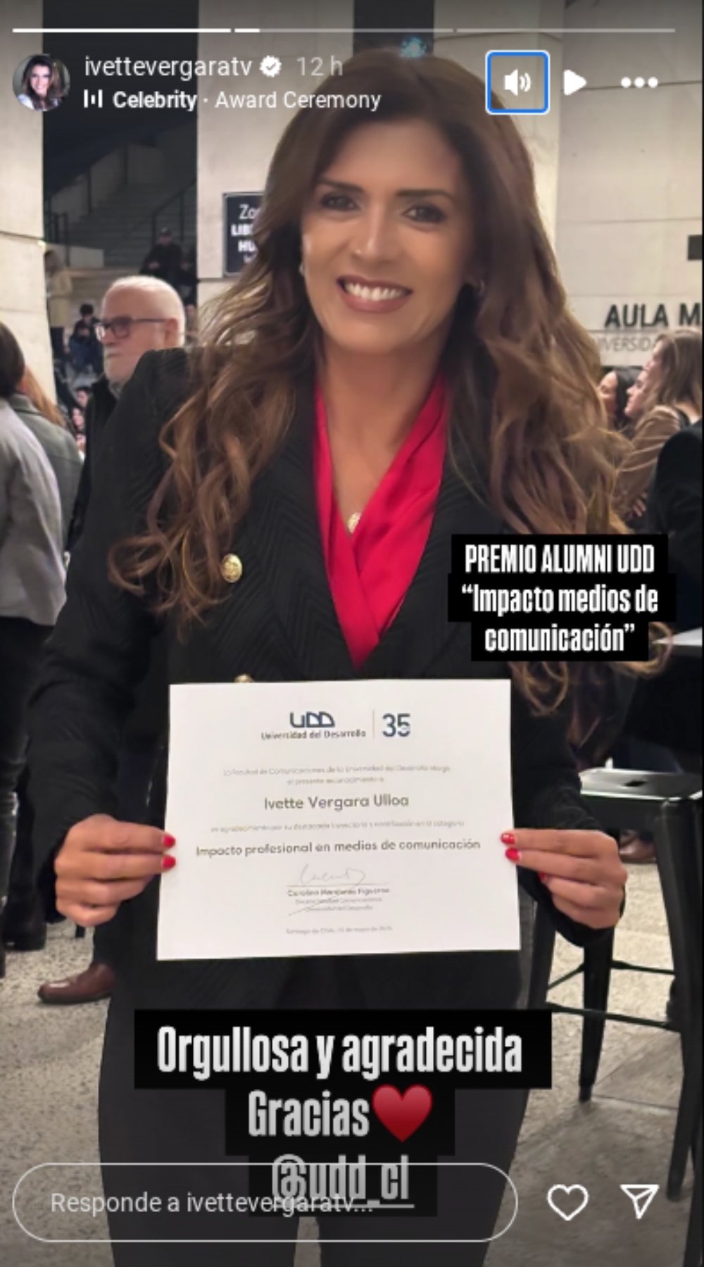En sus historias de Instagram, la periodista posó sonriente con el Premio Alumni UDD en la categoría de Impacto en medios de comunicación, un logro que premia su esfuerzo en el ámbito. “Orgullosa y agradecida”, escribió.