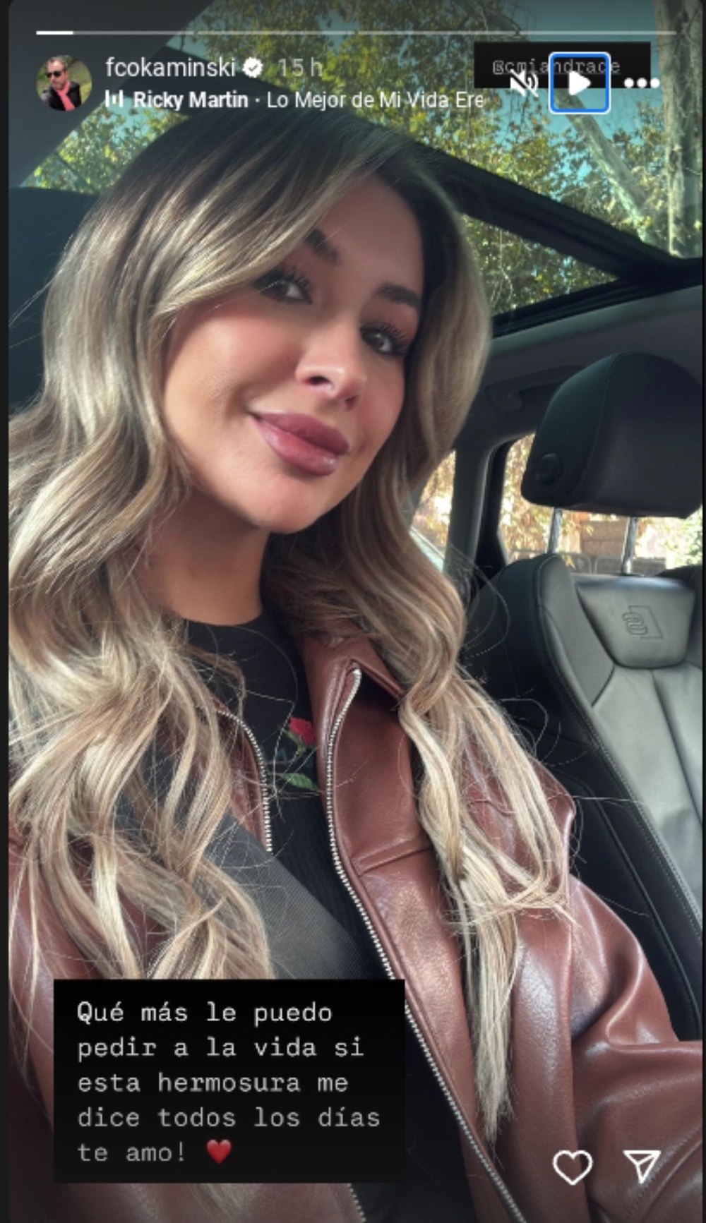 En sus historias de Instagram, Kaminski publicó una postal de la modelo a bordo de un auto, con peinado y maquillaje impecables, mirando a la cámara con una leve sonrisa. “¿Qué más le puedo pedir a la vida, si esta hermosura me dice todos los días ‘Te amo’?”, escribió el animador.