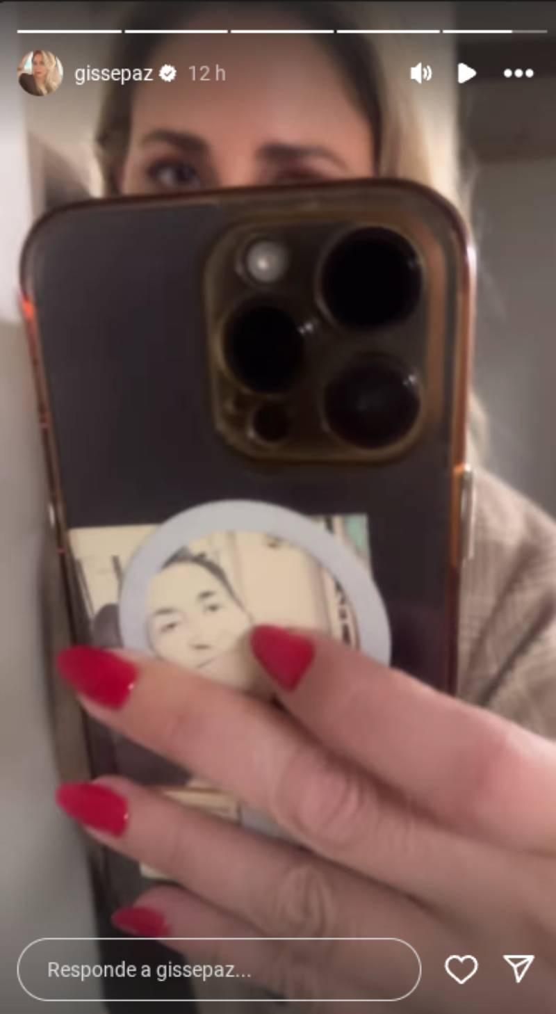 Fue entonces cuando Gissella se acercó al espejo para mostrar su peinado y dejó ver la foto en blanco y negro que guarda en el case de su celular. Un sonriente Jaime Gallardo, su padre fallecido el 5 de enero de 2023, la acompaña siempre.